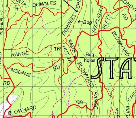 Sam's Hut track was simply not reopened after logging and was and still is on Roof top Maps a link track from nolan's/blowhard range tk intersection to downies spur tk.